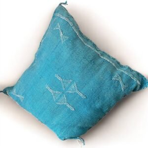Apportez une touche de lumière et de fraîcheur à votre intérieur avec ce coussin berbère bleu turquoise aux motifs blancs, entièrement tissé à la main en soie de cactus (sabra). Sa couleur vive et éclatante évoque la mer et le ciel méditerranéen, tandis que ses motifs géométriques traditionnels apportent authenticité et charme artisanal.