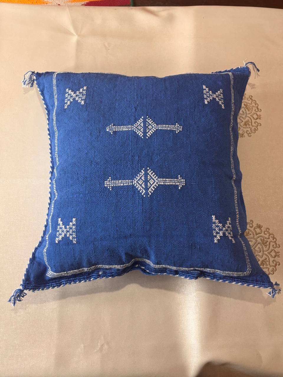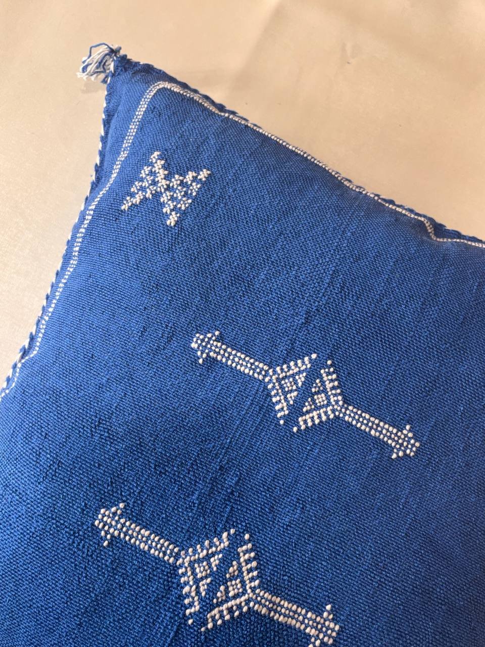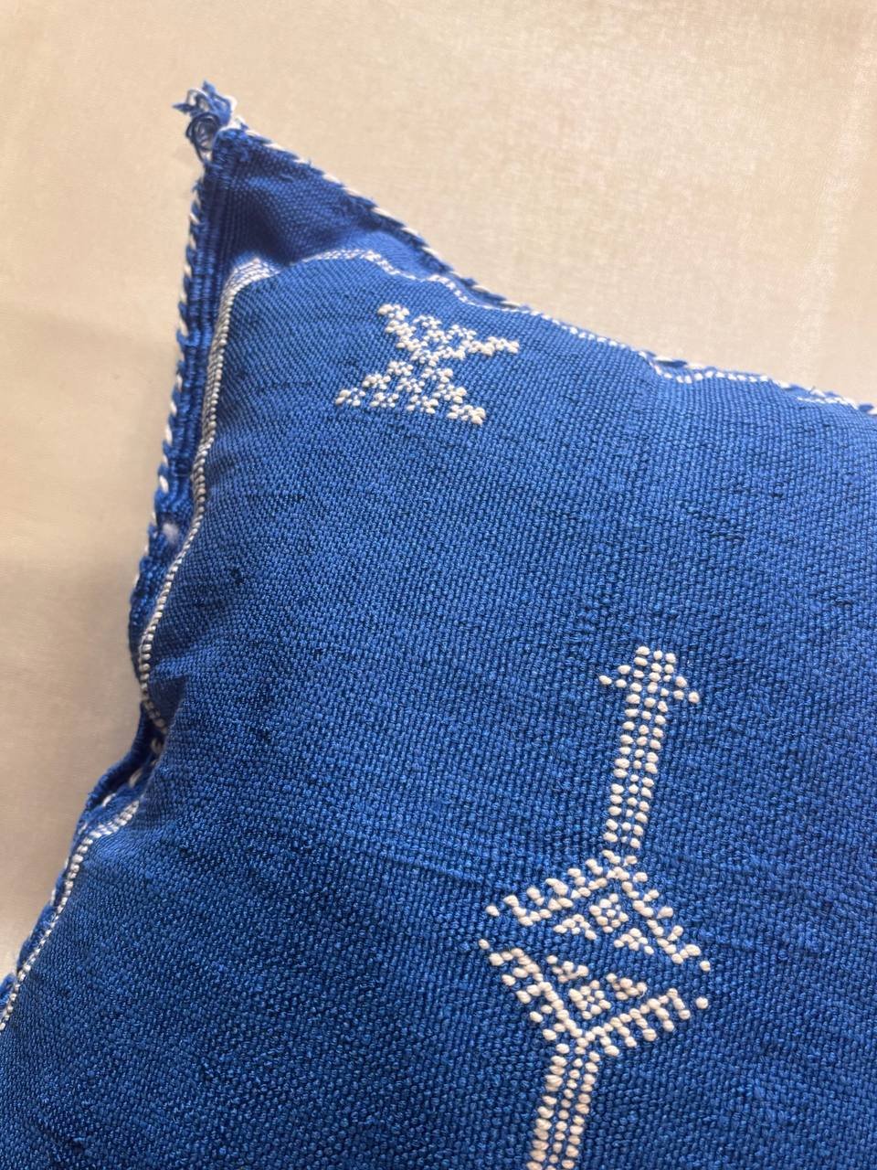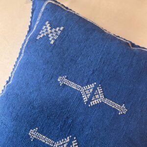 Ce coussin bleu profond évoque la mer et le ciel marocain. Les broderies blanches géométriques apportent contraste et élégance.