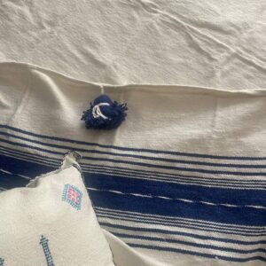 Une couverture comme un souffle du Sud. Cette pièce tissée à la main au Maroc mêle avec douceur le blanc éclatant du coton naturel et l’intensité des rayures bleues, rappelant les ruelles d’Essaouira, la mer Méditerranée ou les céramiques de Fès. Ornée de pompons tressés à la main, elle allie sobriété et caractère.