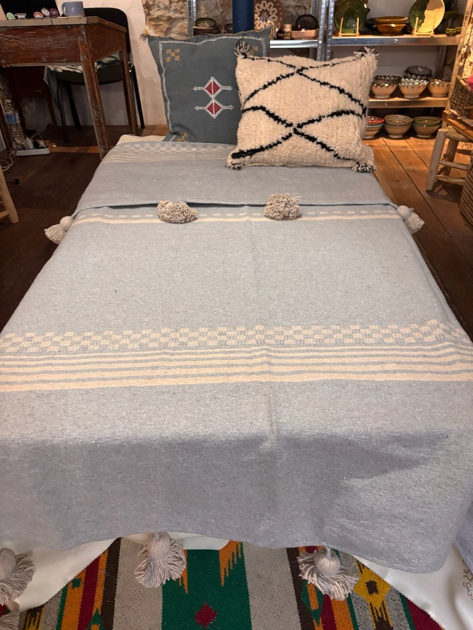 Tissée sur métier traditionnel, chaque couverture reflète l’héritage du tissage marocain. Le coton naturel utilisé est doux, respirant et résistant. Les pompons noués à la main renforcent son charme artisanal, unique et chaleureux.
