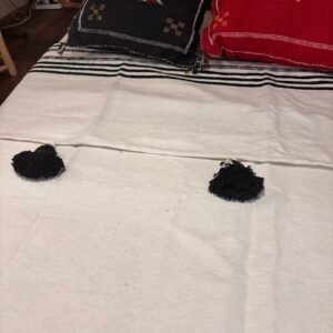 Une pièce intemporelle et élégante, entièrement tissée à la main au Maroc. Son fond blanc immaculé est rehaussé de rayures noires nettes et graphiques, accompagnées de pompons assortis pour une touche authentique et moderne à la fois.