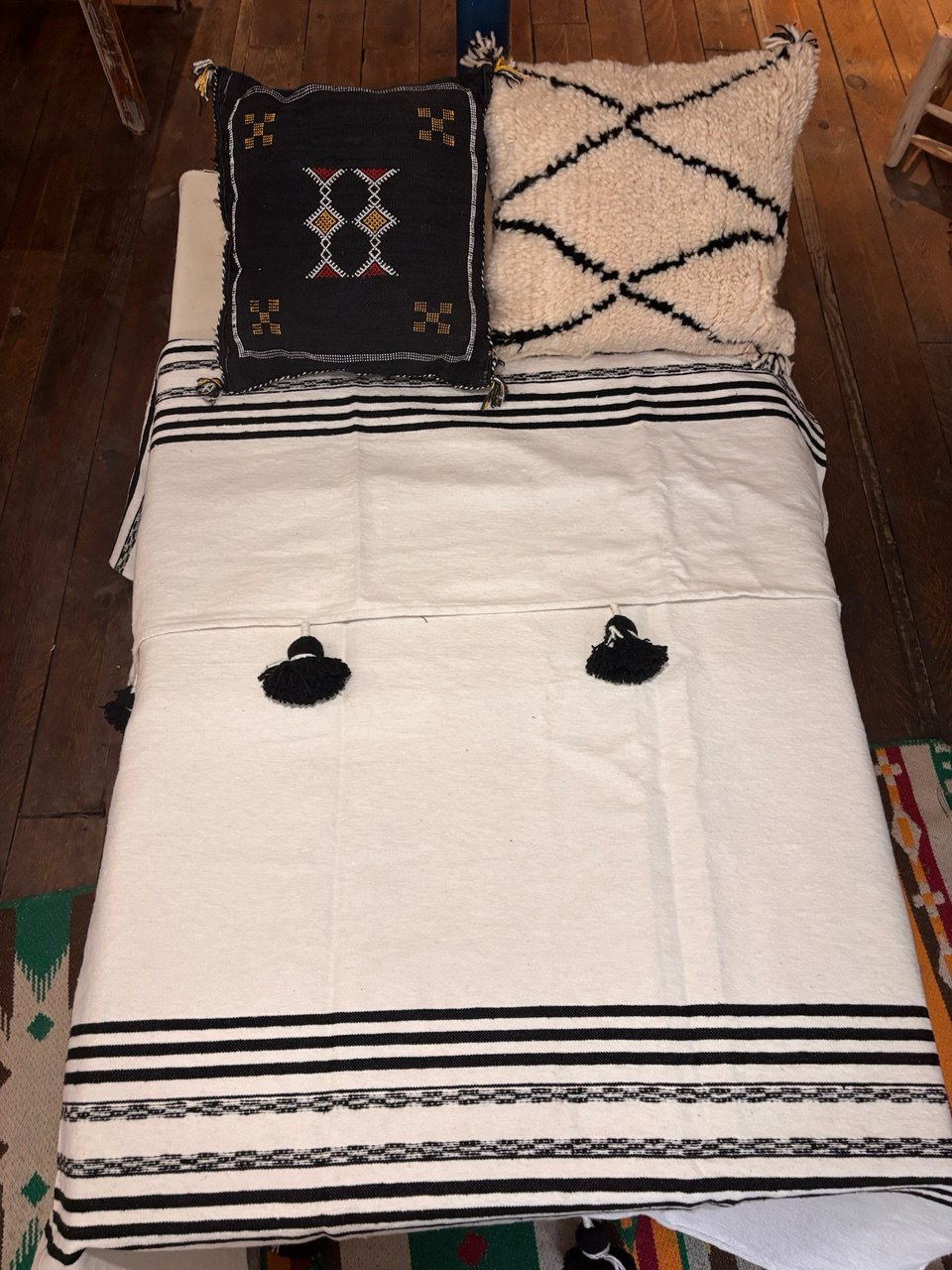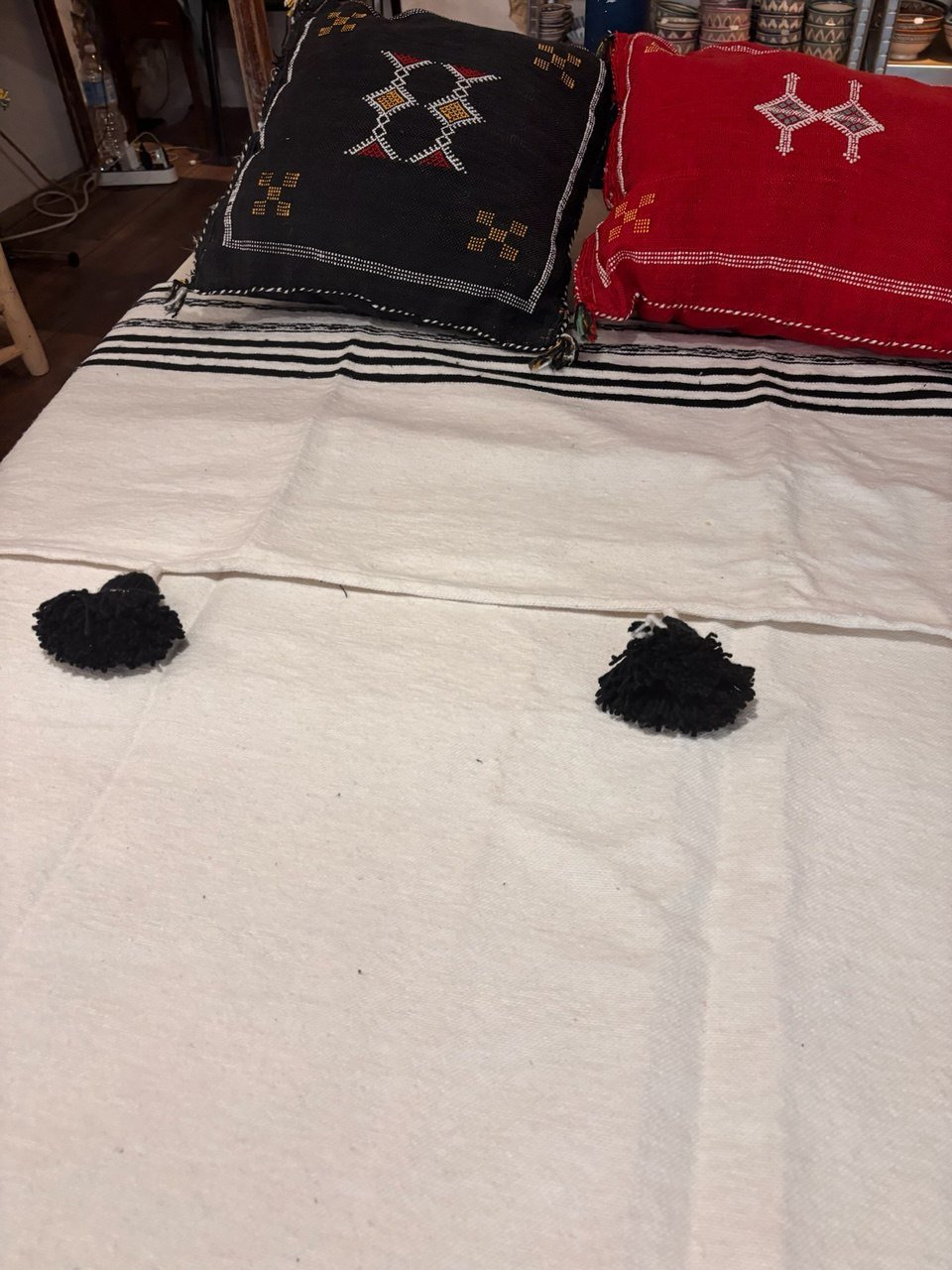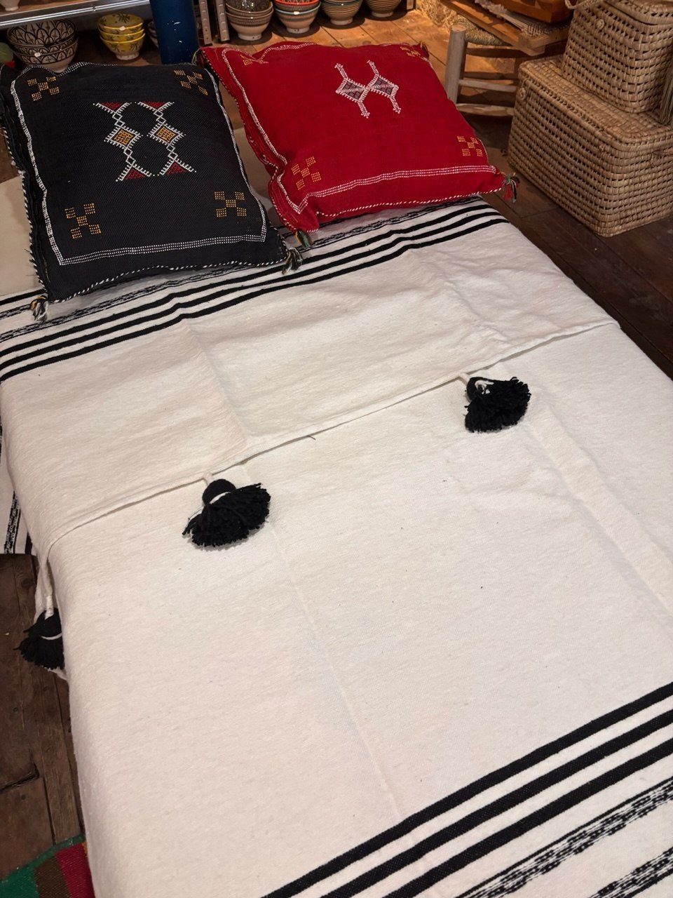 Tissée sur métier traditionnel, chaque couverture reflète le savoir-faire des artisans marocains. Le coton naturel est doux, respirant et durable. Les pompons noirs noués à la main ajoutent une finition authentique et chaleureuse.