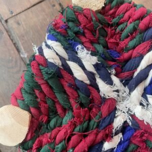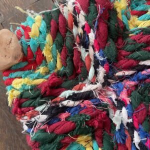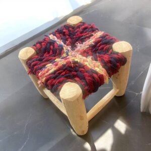 L’assise est réalisée à partir de tissus recyclés, découpés dans des vêtements usagés puis tressés à la main par des artisans. Chaque pièce est ainsi totalement unique : les couleurs varient d’un modèle à l’autre selon les chutes disponibles, ce qui donne à chaque tabouret son propre caractère. Rouge, vert, bleu, blanc… ces teintes s’entrelacent pour former une assise à la fois confortable, esthétique et écoresponsable.