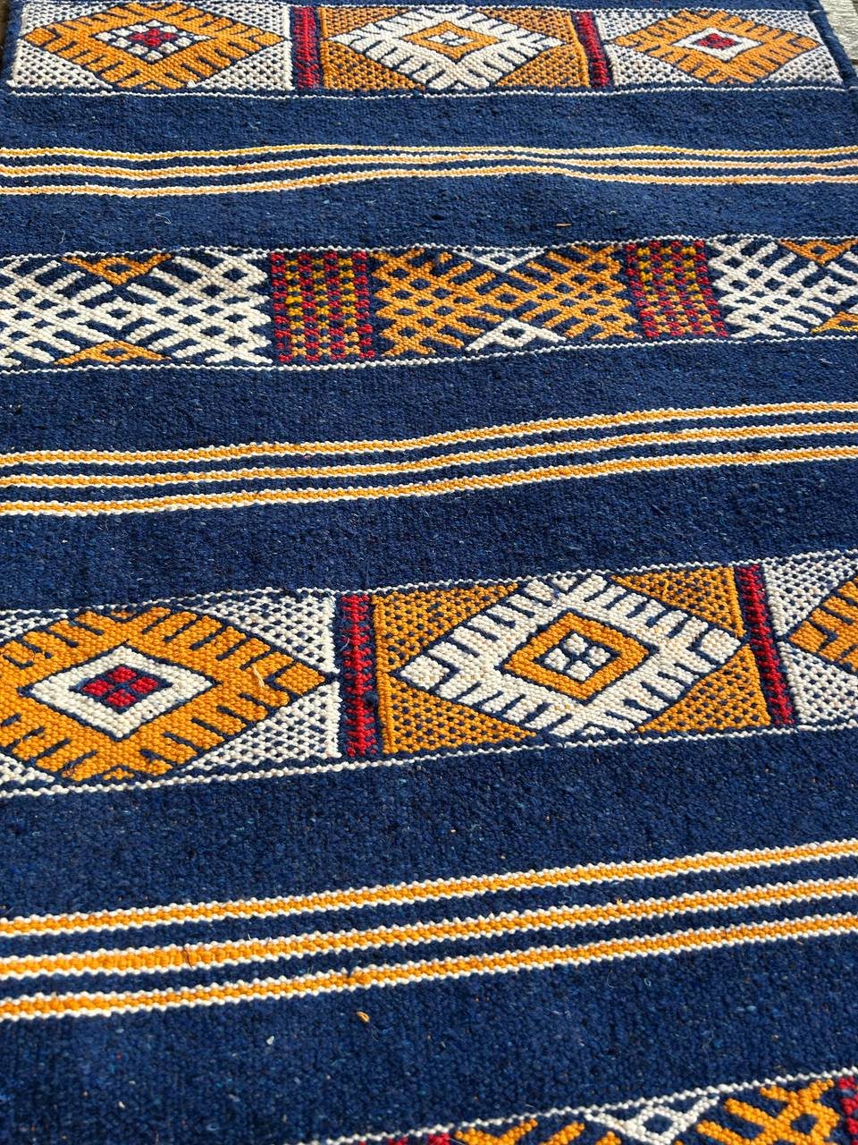 Ce kilim vient du Sud marocain. Le bleu profond — couleur du ciel nocturne et de l’infini — y est entouré de l’orange vibrant du safran et du soleil. Les motifs géométriques répétés de bande en bande ne sont jamais tout à fait identiques : c’est la main qui décide, pas le dessin.