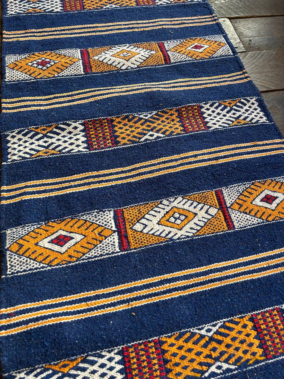 Kilim berbère tissé main au Maroc. Fond bleu nuit, motifs géométriques orange safran et blanc—  Disponible en boutique à Montpellier.