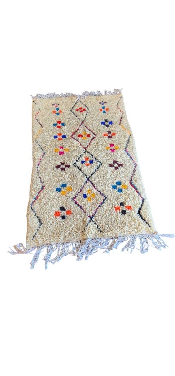 Le Tapis Berbère Constellation est une pièce douce et lumineuse, ponctuée de petits motifs colorés disposés comme des étoiles. Son dessin équilibré et ses teintes chaleureuses apportent une touche bohème et authentique à n’importe quel intérieur.