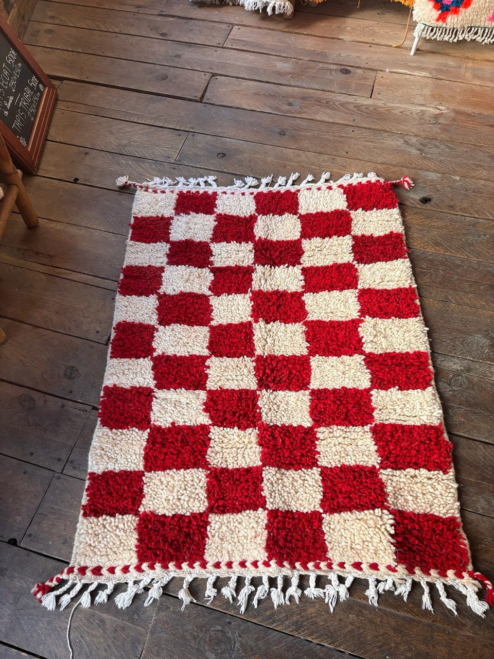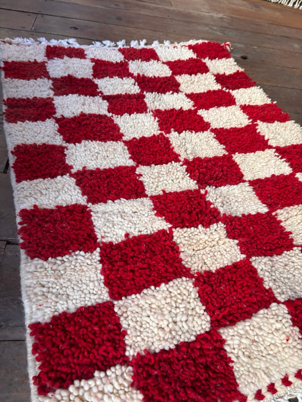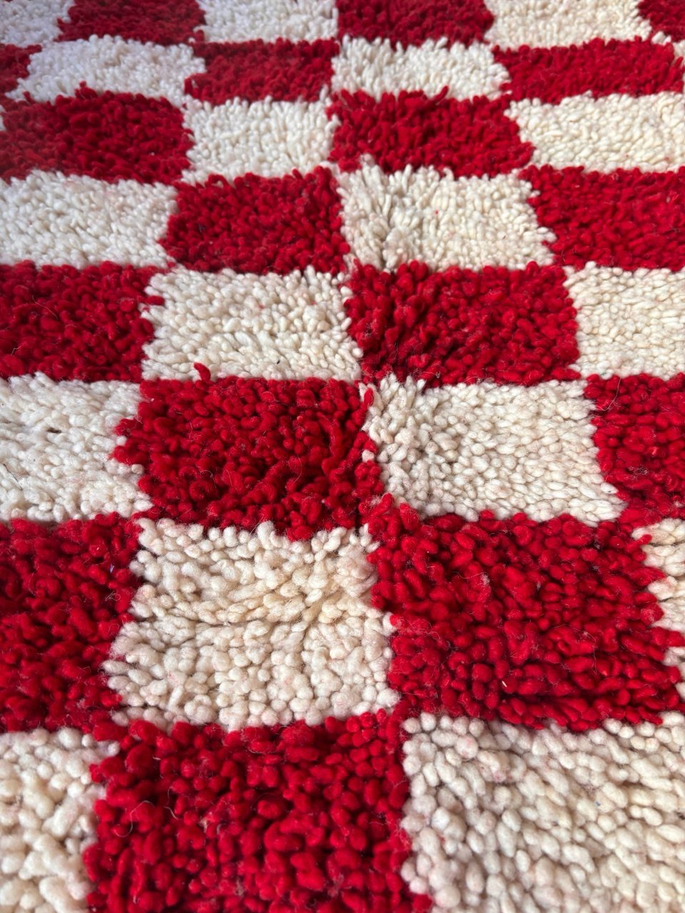 Ce tapis berbère à motif damier rouge et écru est entièrement tissé et noué à la main par des artisanes marocaines. Son dessin graphique et intemporel apporte une touche moderne tout en restant ancré dans la tradition.