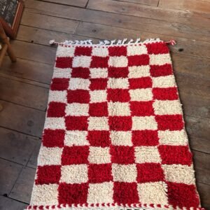Tapis berbère damier rouge et écru épais et moelleux, fait main au Maroc. Laine naturelle, 105 x 75 cm, 130 €. Un tapis graphique et artisanal.