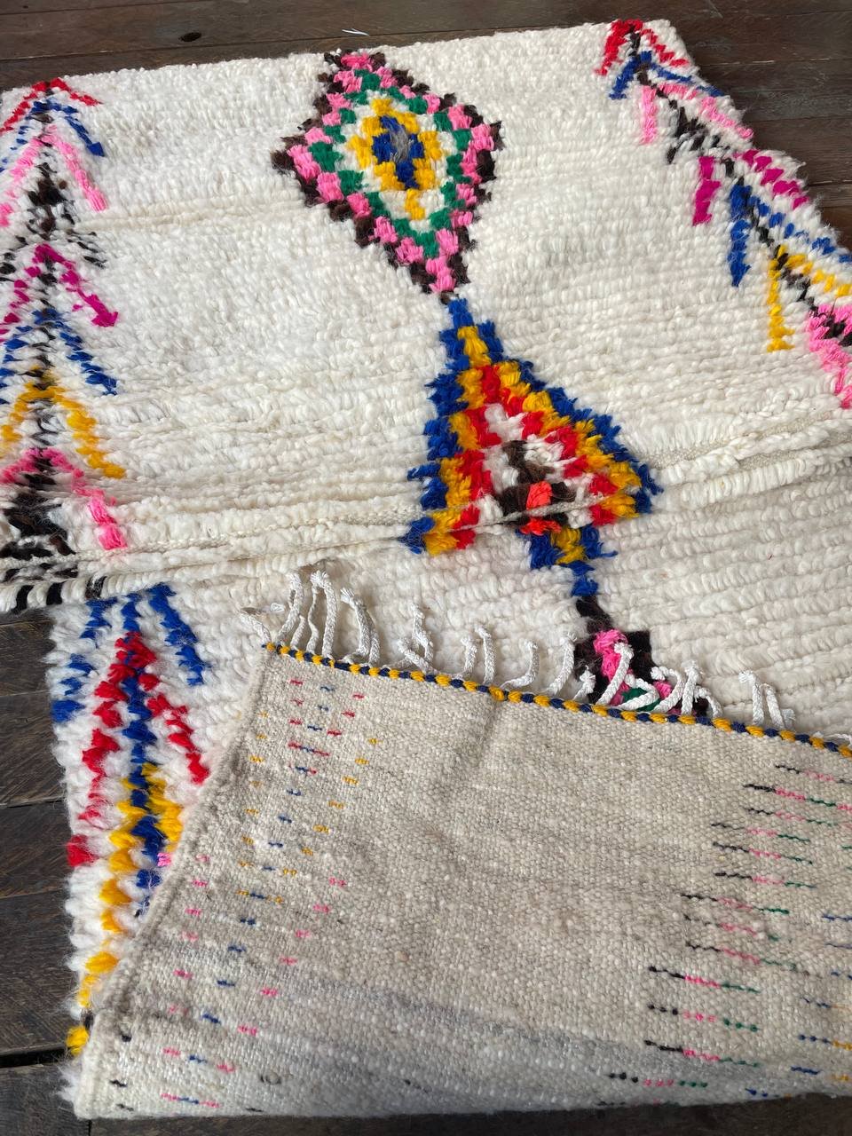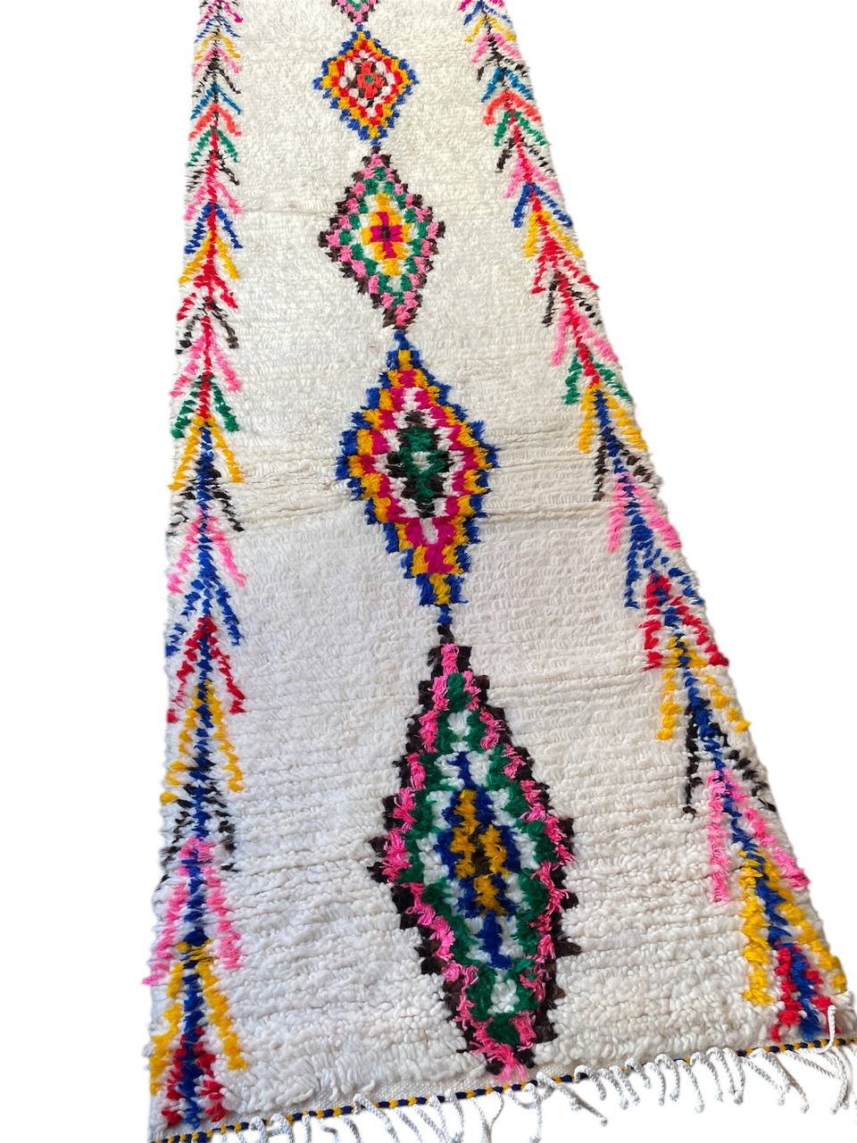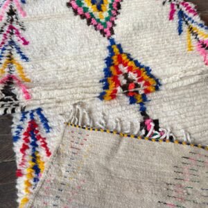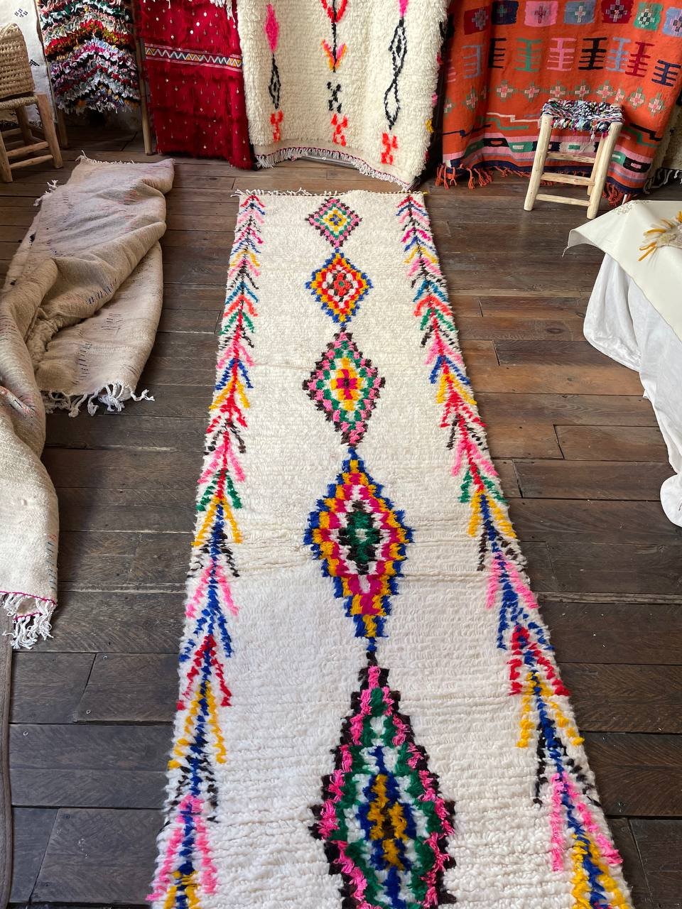 Dimensions : 300 × 85 cm (tapis couloir / entrée) Matière : 100 % laine naturelle — douce et résistante, idéale pour les zones de passage Motifs : Losanges et symboles berbères inspirés de la nature Couleurs : Fond écru, touches rose · bleu · jaune · vert