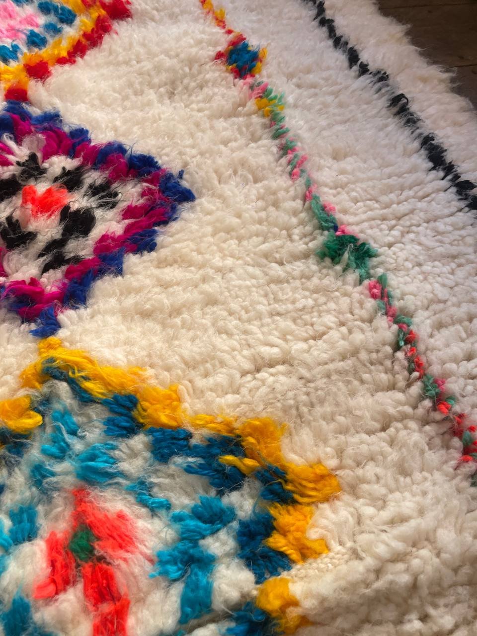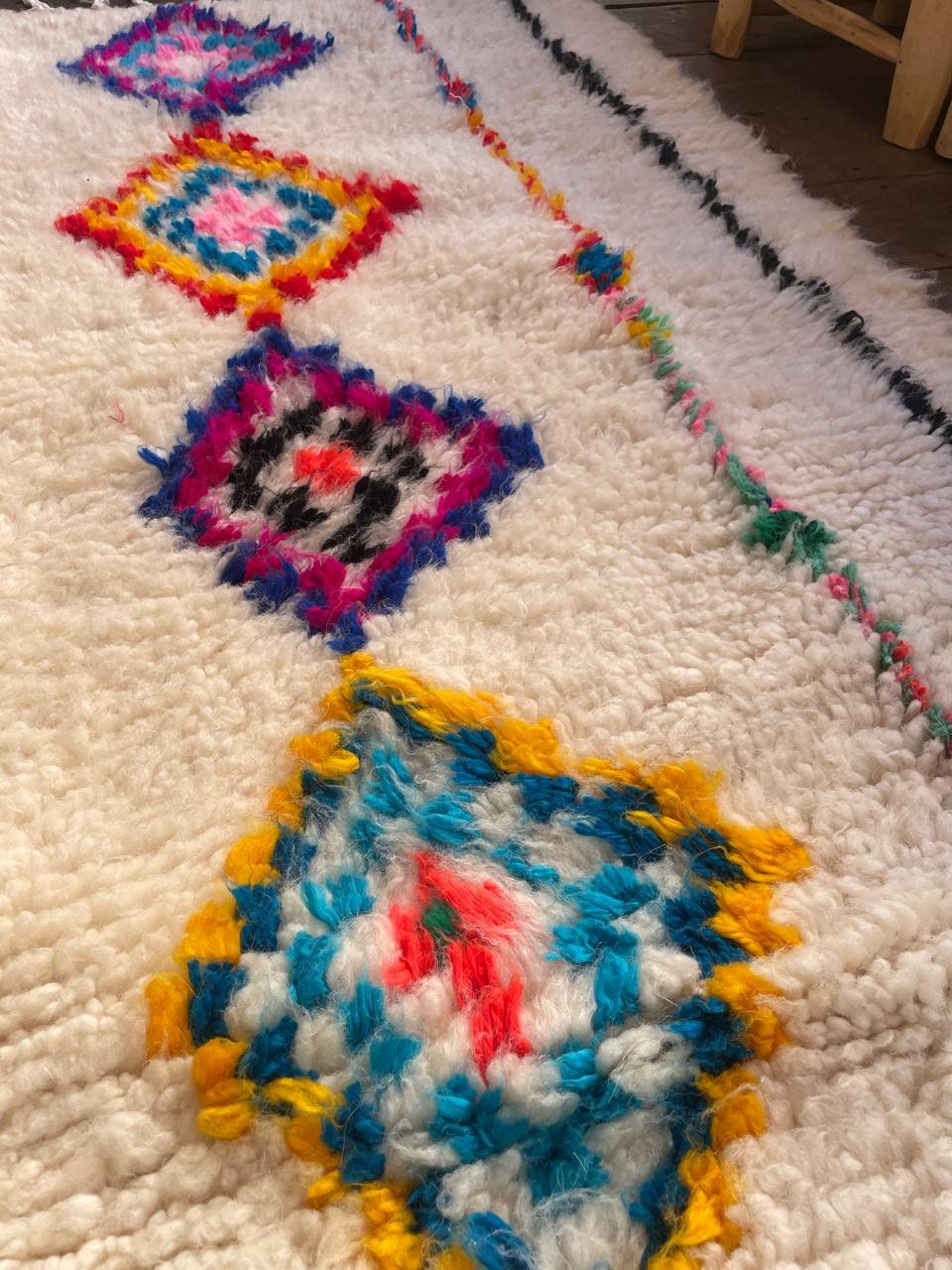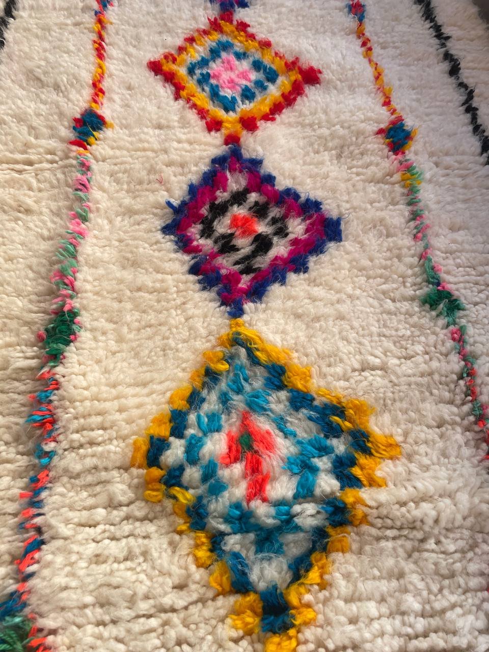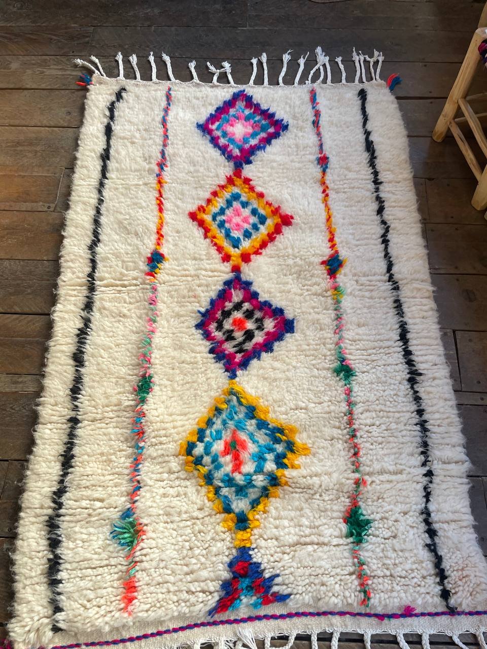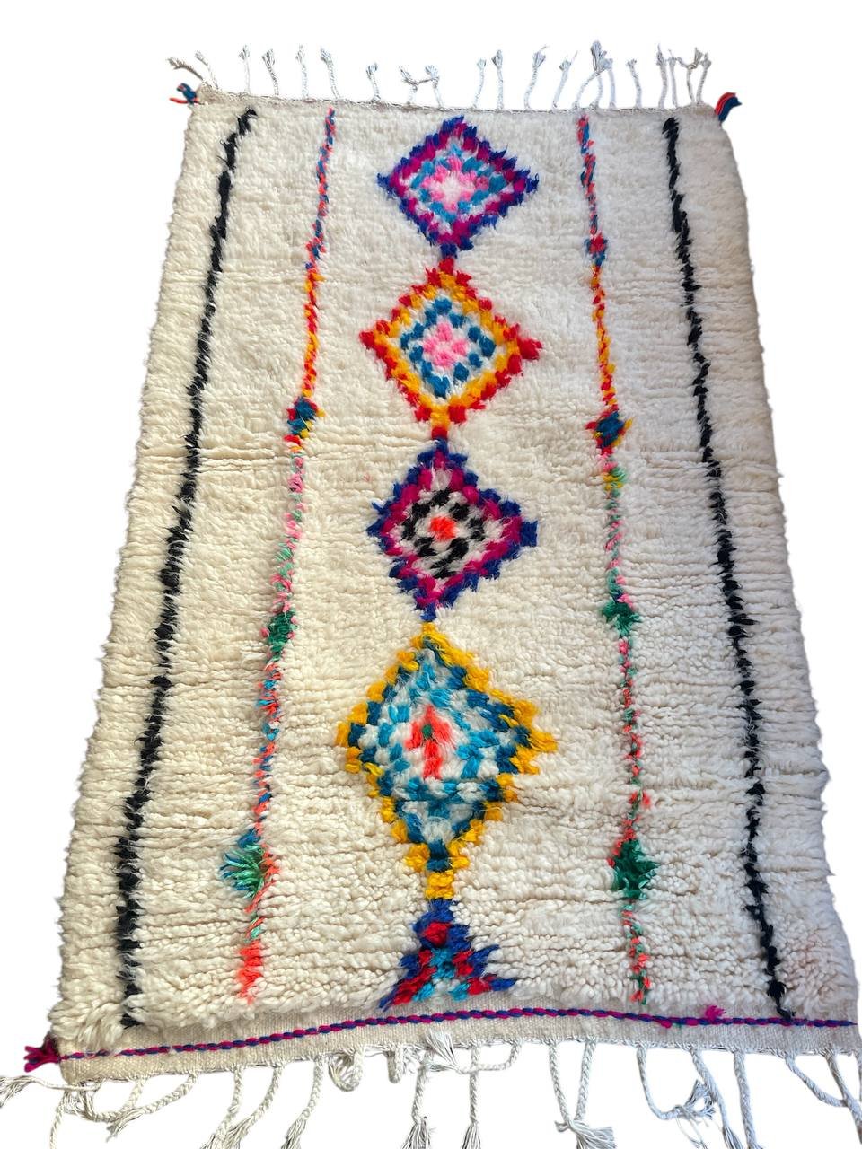 Le Tapis Berbère Diamant du Sud marie la puissance des motifs berbères à la douceur de la laine naturelle. Tissé à la main par les femmes de ma famille, il se distingue par une rangée de losanges multicolores au centre, encadrée de fines lignes noires et colorées.