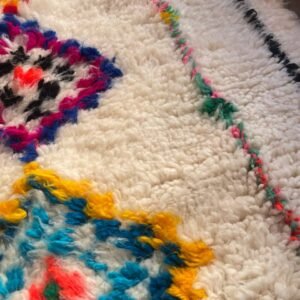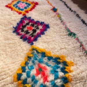 Les losanges, symboles de protection et d’équilibre, se déclinent dans des teintes vibrantes — bleu, rose, orange, jaune, vert — sur un fond écru lumineux. Ce contraste donne au tapis une allure contemporaine tout en conservant son authenticité berbère.