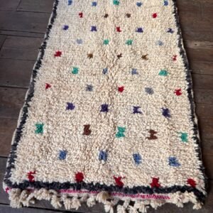 Apportez une note de joie et d’authenticité à votre intérieur avec ce tapis berbère écru à pois colorés. Tissé à la main par des artisanes marocaines, il incarne tout le charme et la qualité des créations traditionnelles du Moyen Atlas. Ses petits motifs colorés évoquent des pois brodés, donnant un aspect à la fois ludique et élégant qui se marie à tous les styles de décoration.