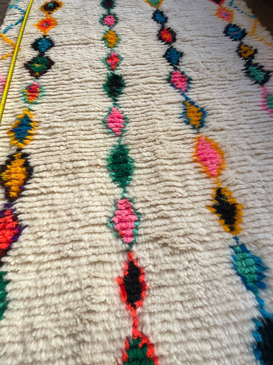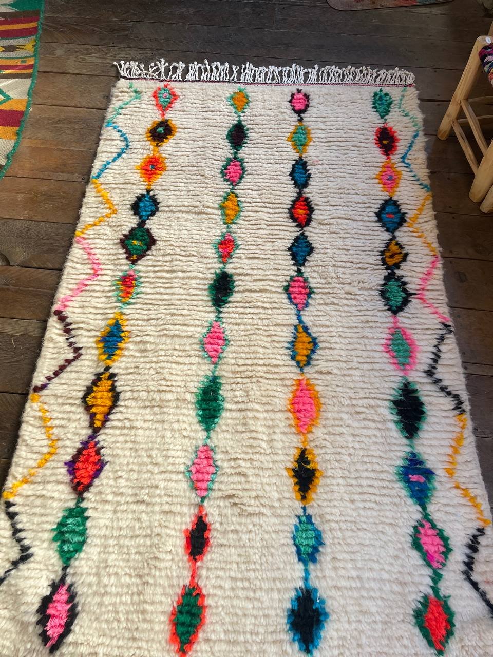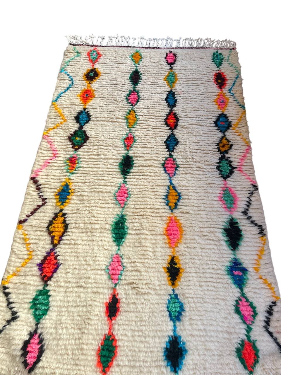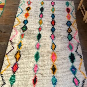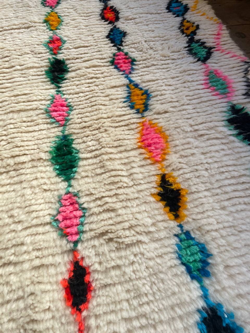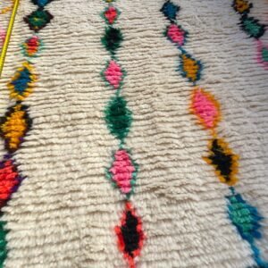 Le Tapis Berbère Fleurs du Sud célèbre la vitalité des couleurs marocaines. Sur un fond écru moelleux, de fines colonnes de motifs en forme de feuilles et d’amandes tissées à la main se succèdent dans des tons éclatants : rose, vert, orange, turquoise et jaune.