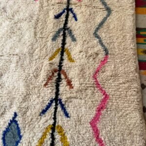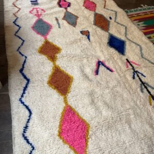 Le Tapis Berbère Harmonie des Losanges séduit par son équilibre et sa douceur. Sur un fond écru épais, de grands losanges colorés – bleu profond, rose, ocre et gris – structurent l’espace avec élégance.