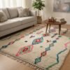 Le Tapis Berbère Harmonie des Losanges séduit par son équilibre et sa douceur. Sur un fond écru épais, de grands losanges colorés – bleu profond, rose, ocre et gris – structurent l’espace avec élégance.