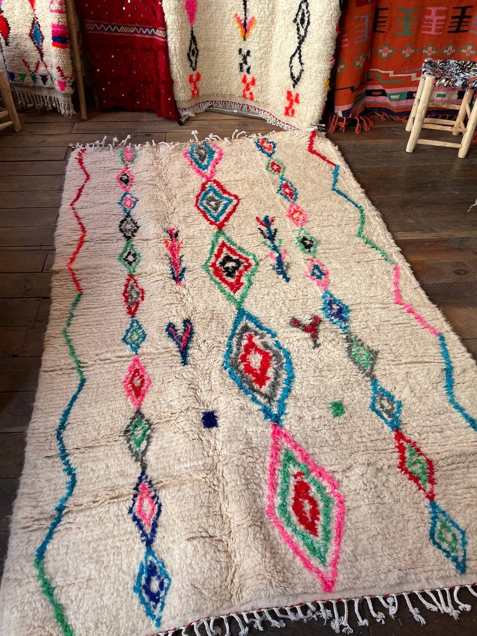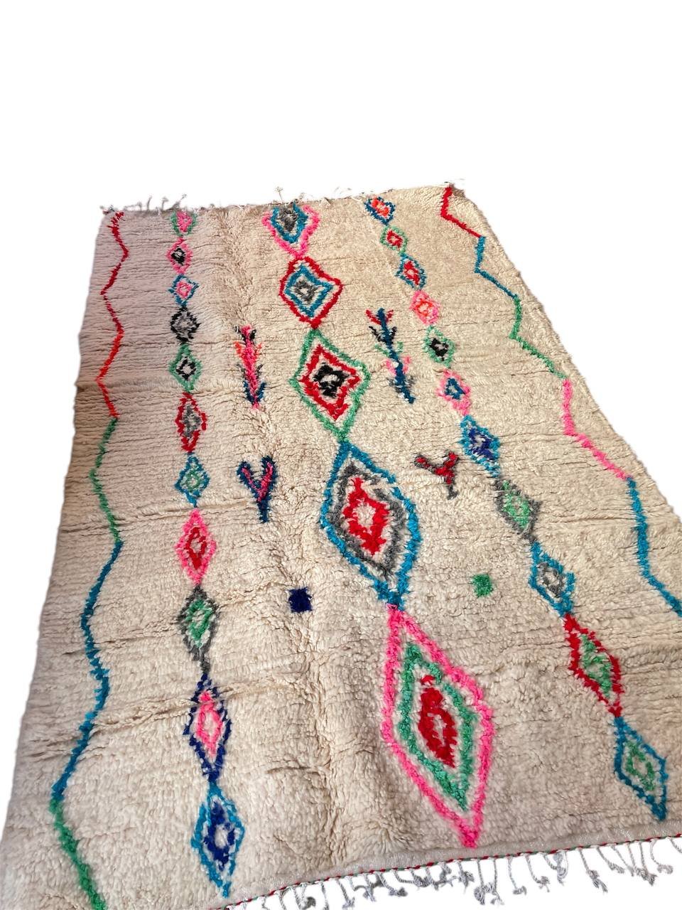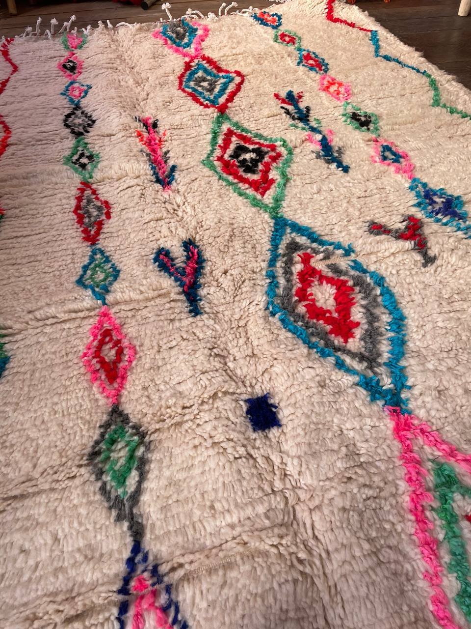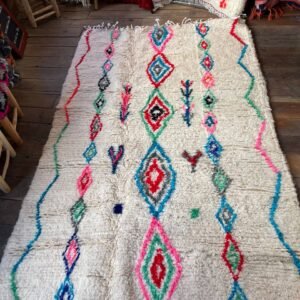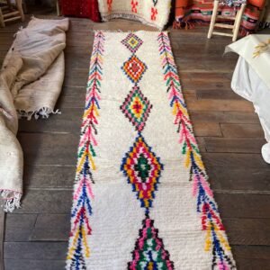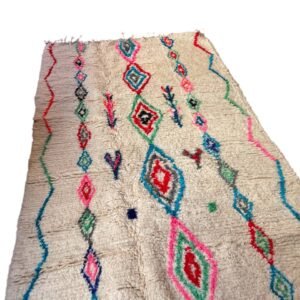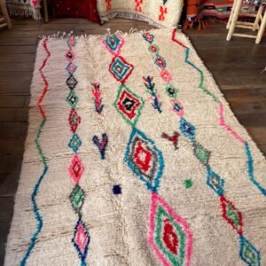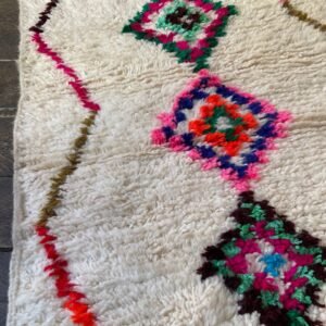 Ce tapis a été tissé par les femmes de ma famille au Maroc, sans modèle figé. Chaque motif naît du geste, de la mémoire et de l’instant. Les losanges que vous voyez sont des symboles puissants dans la culture berbère : ils représentent la protection, la féminité et la transmission. Les lignes ondulées sur les côtés évoquent les chemins de la vie, sinueux mais toujours en mouvement. Les petites touches de couleurs — rose, bleu, vert, rouge — traduisent la joie et les émotions de la tisseuse au moment de la création.