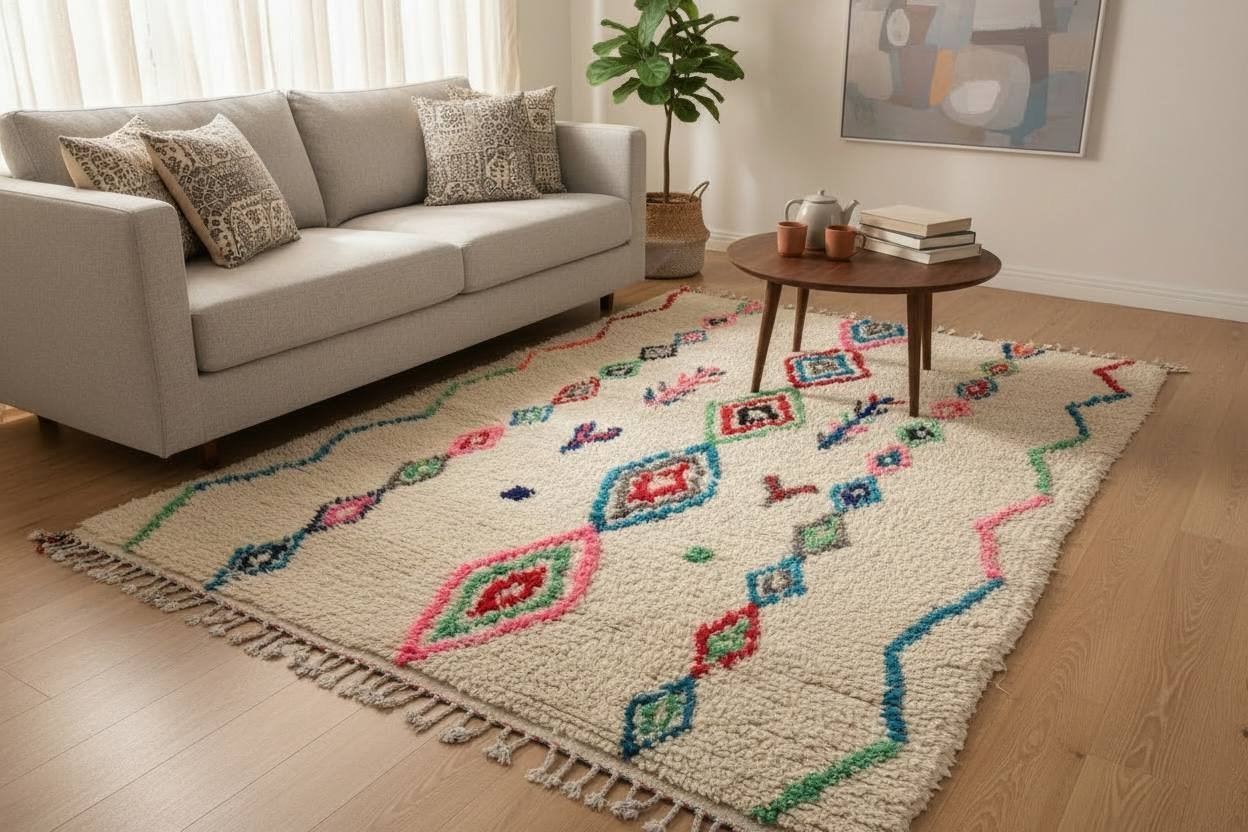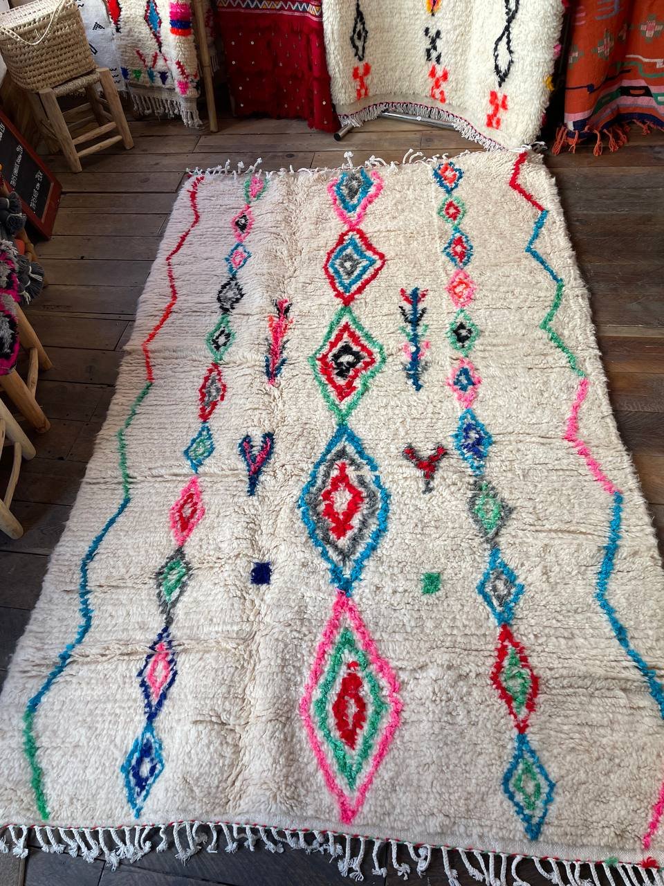 Dimensions : 250 × 150 cm (grand format salon) Matière : 100 % laine naturelle — épaisse, douce, résistante Motifs : Losanges berbères et lignes ondulées Couleurs : Fond écru, touches rose · bleu · vert · rouge