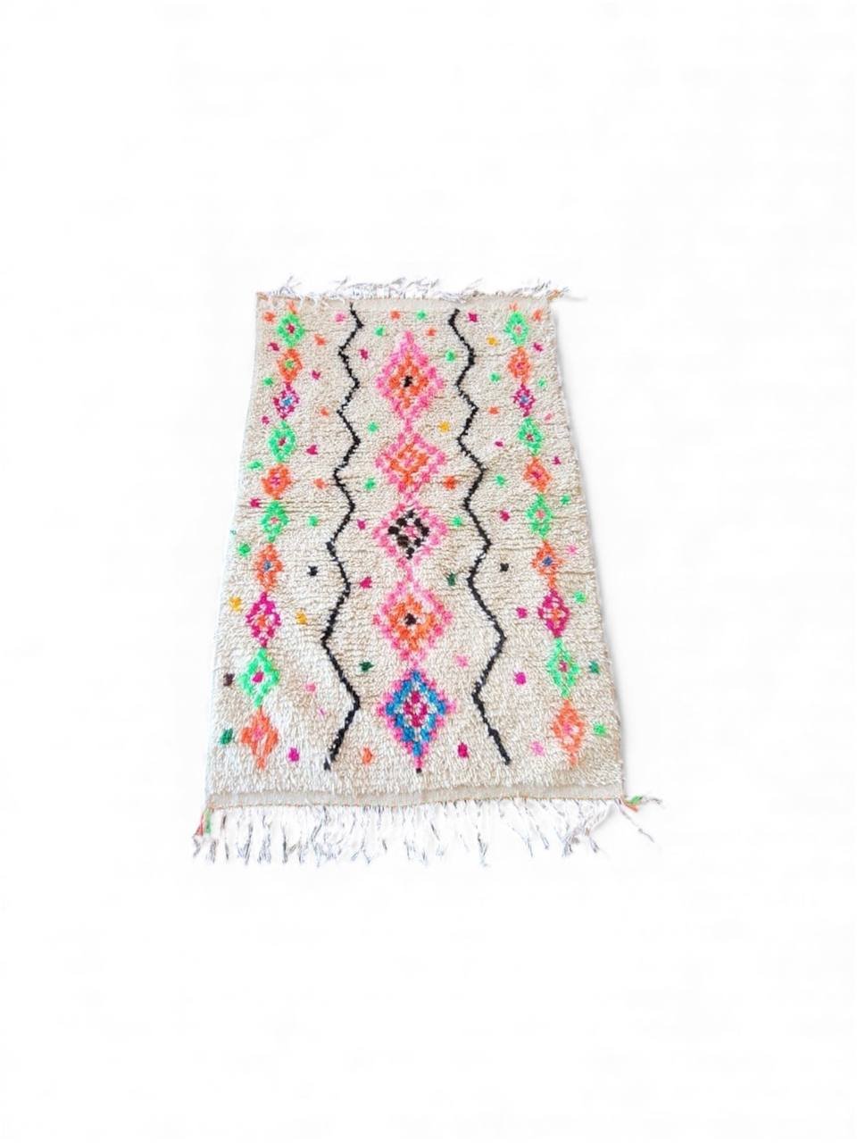 Tissé à la main par les femmes de ma famille, ce tapis dégage une énergie douce et lumineuse. Il est parfait pour créer une atmosphère chaleureuse dans une chambre, un salon ou un coin lecture.