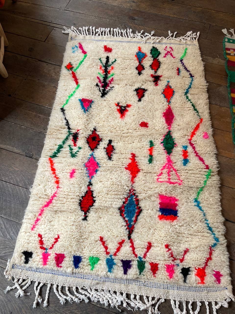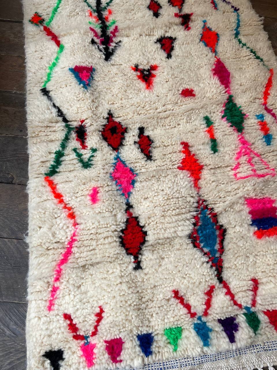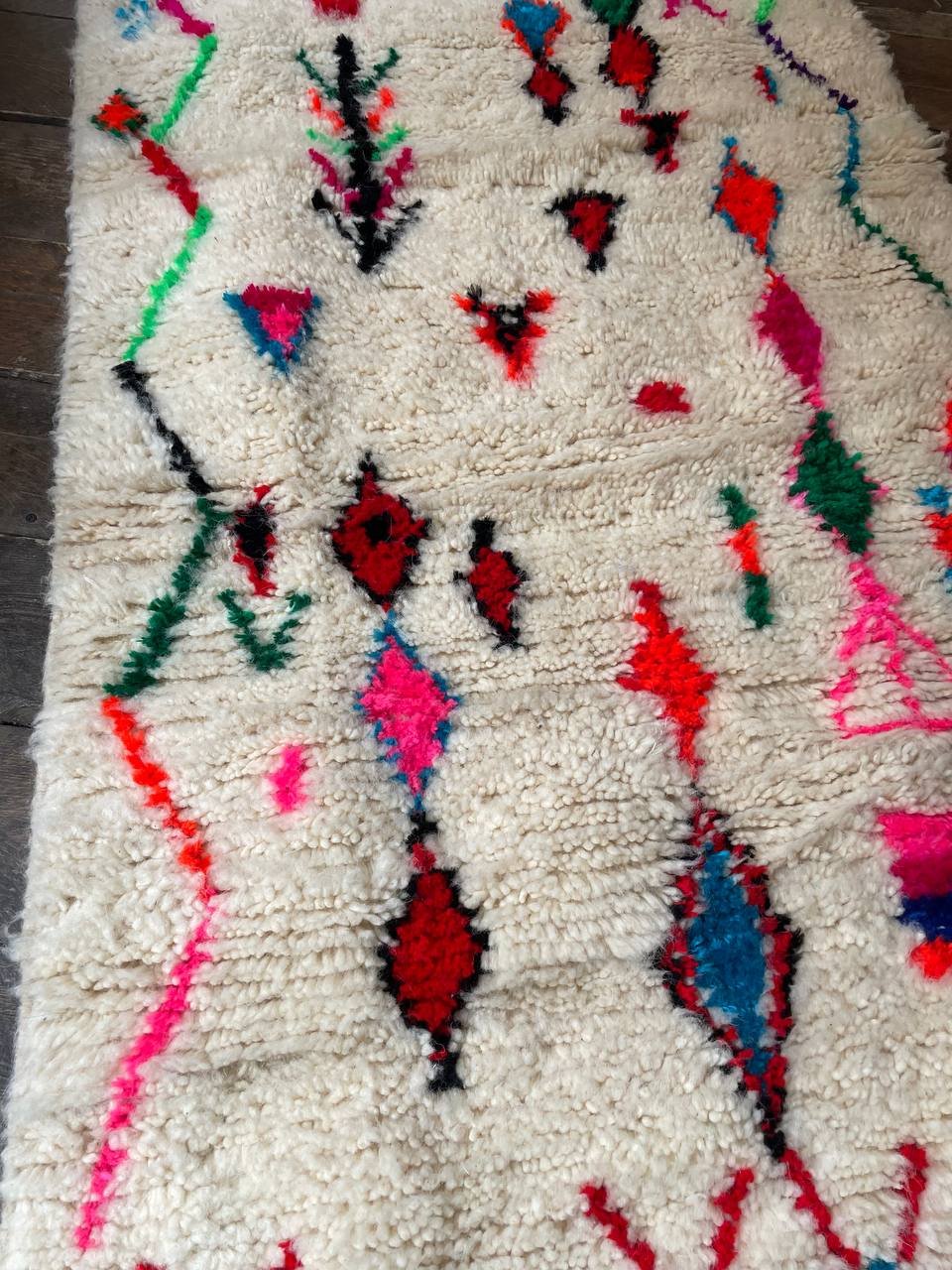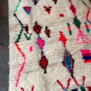 Le Tapis Berbère Symboles Nomades Multicolores raconte une histoire libre et spontanée, tissée fil après fil au Maroc par les femmes de ma famille.