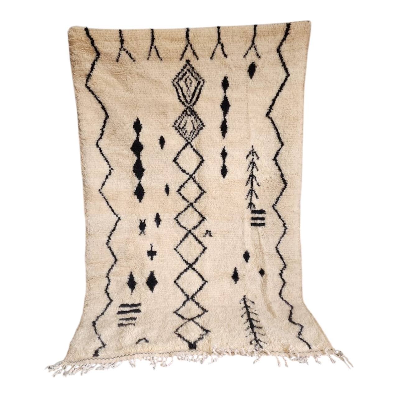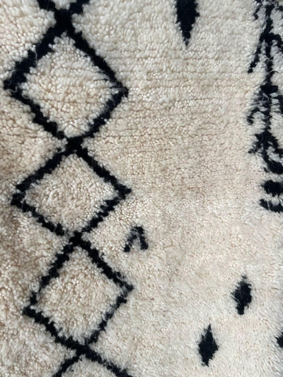 Réalisé en laine naturelle, le “Aït Hnini” mesure 250 x 150 cm, une dimension idéale pour sublimer votre salon, votre chambre ou un coin lecture. Son fond écru lumineux est mis en valeur par des motifs noirs géométriques, typiques de la tradition berbère. Chaque symbole possède sa propre signification et reflète l’histoire et la culture des femmes qui l’ont tissé, transformant votre tapis en véritable récit textile.