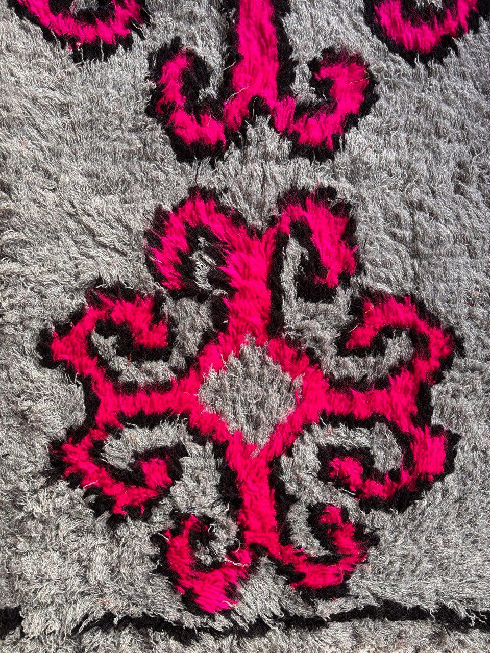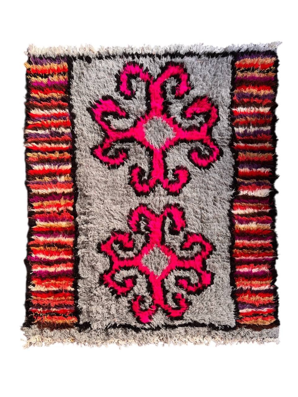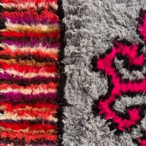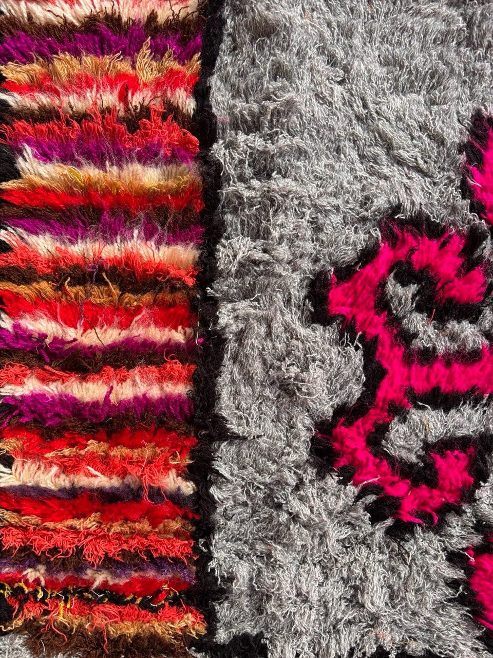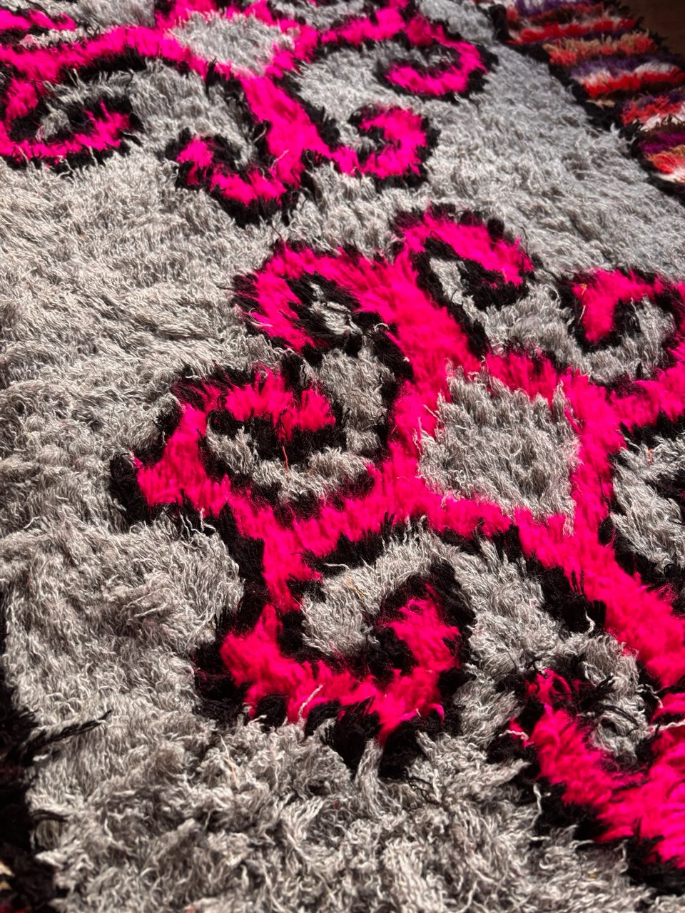 Avec ses tons vifs de rose, noir, gris, rouge et beige, ce tapis 90 × 80 cm illumine instantanément une pièce. Le centre présente un motif floral berbère intense, entouré d’une mosaïque de couleurs texturées.