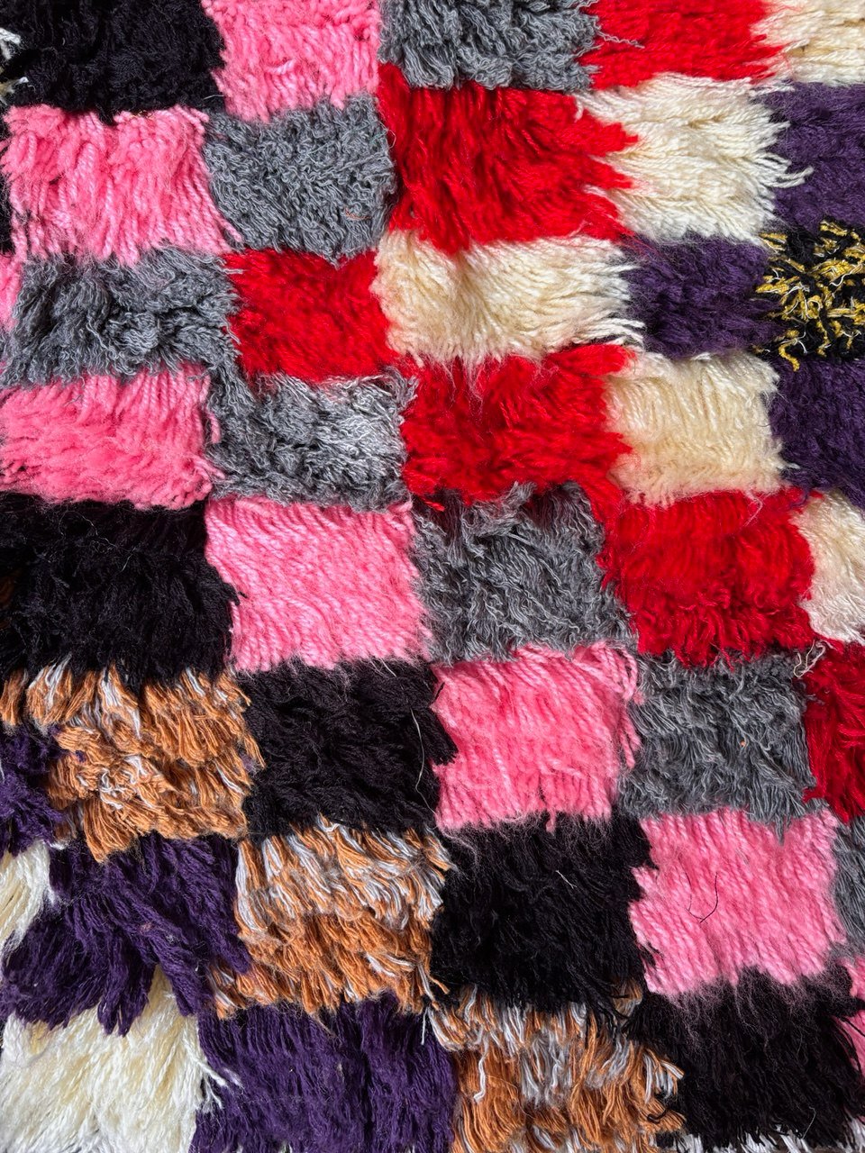 Chaque carré de couleur – rose, rouge, beige, noir, gris, violet – a été attaché un à un, créant un effet patchwork très texturé. Avec ses dimensions pratiques 90 × 80 cm, il est parfait pour :